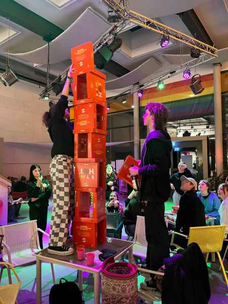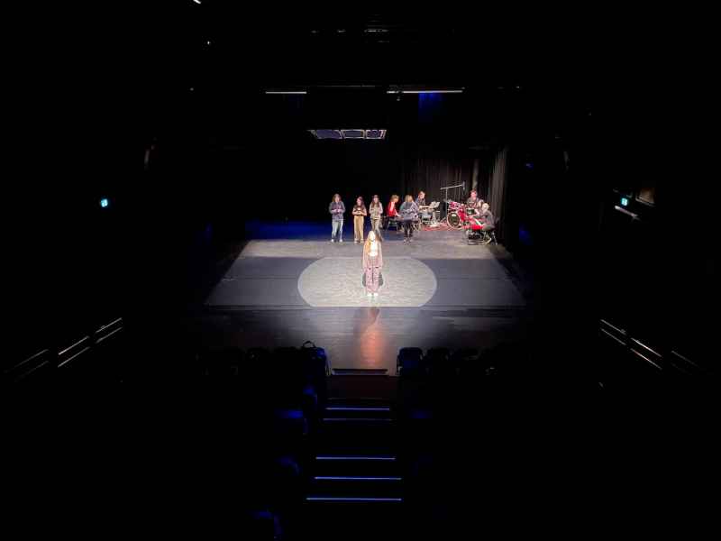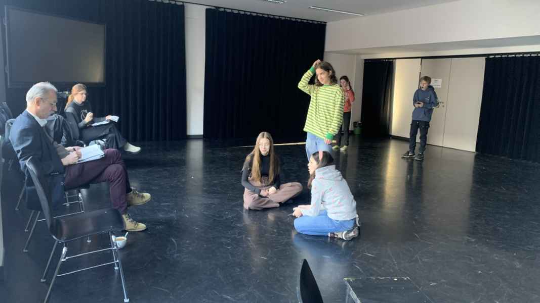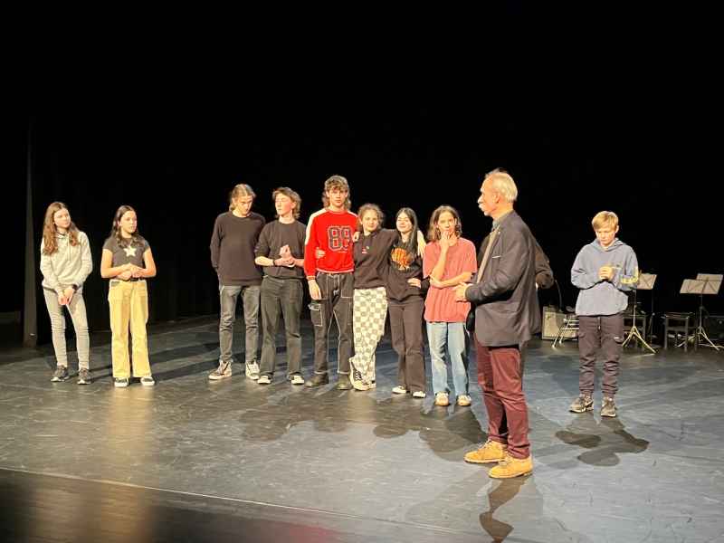 Am nächsten Tag war unsere eigene Premiere, weswegen wir auf der Bühne proben durften. Die Premiere unseres Stückes "The Mobile Phone Show" lief super und wir haben dann auch wie die Gelsenkirchener Gruppe am Tag zuvor mit leckerer Pizza eine kleine Premierenfeier gefeiert.