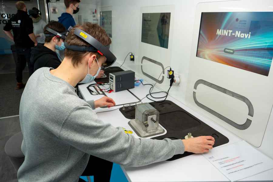 Der TouchTomorrow-Truck überzeugt mit seinen Angeboten sowohl die Lehrkräfte als auch die Schülerinnen und Schüler. „Ein abwechslungsreicher, anschaulicher Unterricht sowie weiterführende MINT-AG-Angebote sind von zentraler Bedeutung, um die Begeisterung unserer SchülerInnen für naturwissenschaftlich-technische Fächer zu wecken und Talente zu fördern“, erklärt MINT-Koordinatorin Sandra Gruschkuhn, während sie mit einer Schülergruppe den Truck besucht. „Der Besuch des TouchTomorrow-Trucks leistet dazu sicherlich seinen Beitrag“, ergänzt Physik-Lehrer Peer Schneider. „Außerdem haben wir den Luxus, dass der Truck unserer Schule eine ganze Woche zur Verfügung steht. Dadurch können wir unglaublich viele Schülerinnen und Schüler mit den MINT-Fächern auch jenseits des Unterrichts in Kontakt bringen. Wir sind uns sicher, der Besuch wird für unsere SchülerInnen eine spannende Erfahrung sein und ihnen ganz neue Einblicke in die Welt von morgen liefern.“