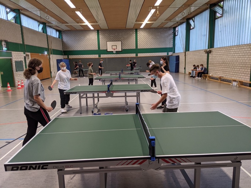 Seit dem Sommer stehen sie bereit, nun sind sie endlich eingeweiht worden: Diese Woche erprobte ein EF-Sportkurs einige der neuen Sportmaterialien. Neben sechs Tischtennisplatten mit Netzen wurden auch neue Schläger und Bälle angeschafft. Ein kleines Tischtennis-Turnier lieferte den ersten Praxistest für die neuen Materialien.