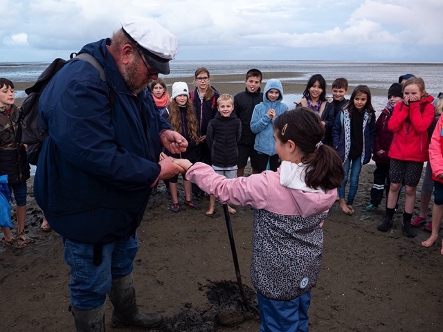 Das war cool. Unser Wattführer zeigte uns ein faszinierendes Tier, dass aussah wie eine Muschel oder ein Stein. Dieses Tier lebt unter der Erde und hat einen Schnorchel. Der Schnorchel ist weiß und die Muschel kann ihn nach oben fahren und dadurch kann es bei Flut Wasser und Nahrung aufnehmen, weil ja der Schnorchel auf dem Wett oder am Grund des Meeres ist. Ich finde, dass das Tier richtig intelligent ist, weil es muss nicht an die Oberfläche und kann so auch nicht von Räubern gefressen werden. Wieder gingen wir ein Stück. Albertus malte mit Schaufel einen großen Kreis in den Sand und sagte wir sollen nicht in den Kreis treten. Alle waren ein bisschen verwundert, weil keiner wusste was jetzt passiert. Albertus sagte er würde uns den Werwurm zeigen. Mit seiner Schaufel holte er einen Wurm aus dem Watt. Er erklärte uns, der Wurm könnte beißen. Luana in der letzten Reihe sagte kein Wurm kann beißen oder so etwas in der Art. Dann aber sagte Albertus Luana soll es selbst spüren und sehen. Albertus zeigte uns erst aber wie die Zähne des Werwurms aussahen. Sie waren klein und spitz. Dann gab Albertus Luana den Werwurm.