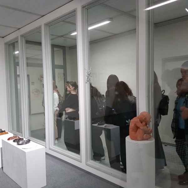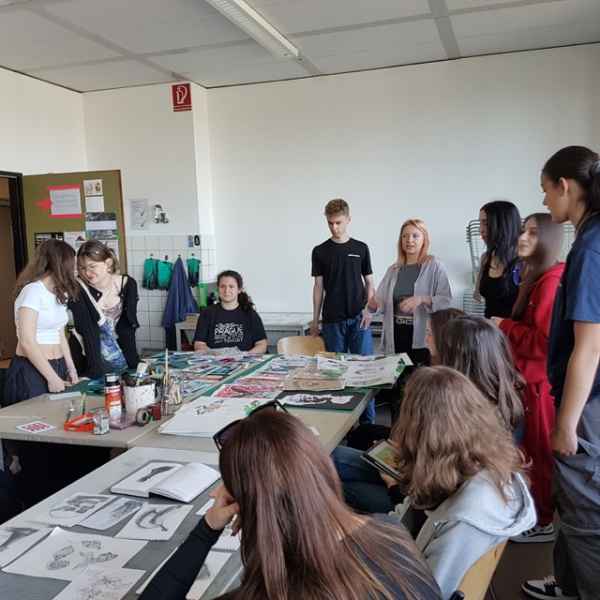 Nach der interessanten Ausstellung präsentierten die Schülerinnen und Schüler den Studentinnen eigene Arbeiten zur praktischen Eignungsprüfung. Im Rahmen der Mappenberatung wurde das Potential der praktischen Schülerarbeiten gemeinsam diskutiert und die Schülerinnen und Schüler erhielten Anregungen zur weiteren Auseinandersetzung.
