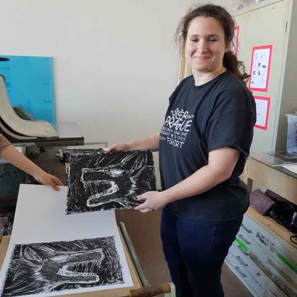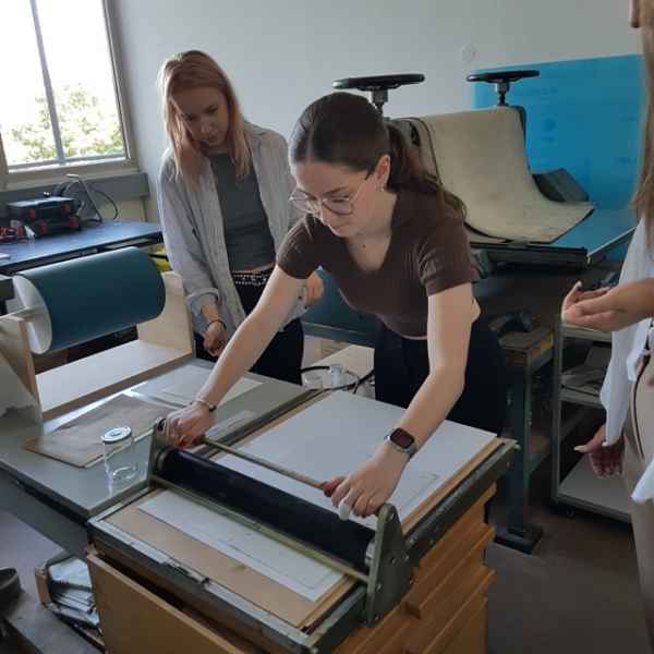 Zu guter Letzt erkundeten die Schülerinnen und Schüler die Werkstätten der Druckgrafik und wurden dort in diverse Techniken der Druckgrafik eingeführt. Die Schülerinnen und Schüler hatten keine Berührungsängste bei der Erkundung des neuen Materials und setzten ihre kreativen Ideen um. Die in der Universität entstandenen Arbeiten sind aktuell im Flur zum Lehrerzimmer in unserer Schule zu sehen.