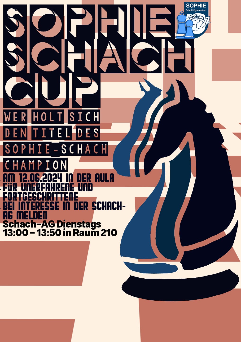 Wir laden euch herzlich zum Sophie-Schach Cup am 12.06.2024 ein! Der Sophie-Schach Cup ist das 2024 eingeführte schuleigene Schachturnier des Sophie-Scholl-Gymnasiums und wird von der Schach AG* organisiert und ausgetragen.